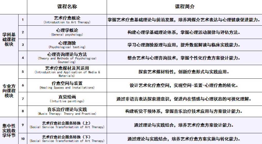 树立正确政治方向与高尚道德品质,夯实科学知识基础,涵养深厚人文素养。系统掌握艺术疗愈基本理论、知识与技能,提升沟通合作能力与创新精神。具备艺术疗愈领域教育教学、管理研究能力以及解决实际问题的专业素养。