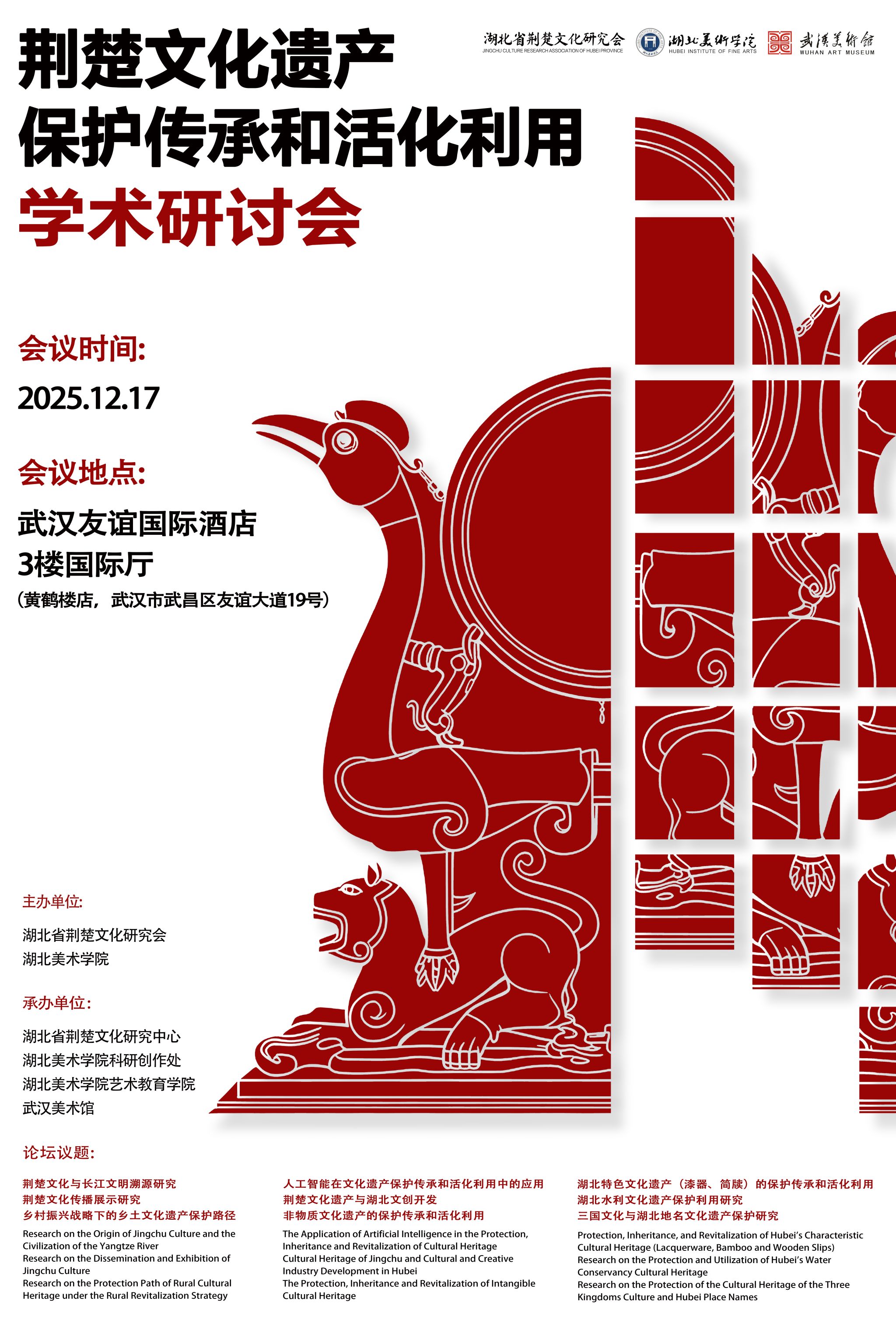 12月17日,由湖北省荆楚文化研究会与湖北美术学院联合主办,湖北省荆楚文化研究中心、湖北美术学院科研创作处、湖北美术学院艺术教育学院、武汉美术馆共同承办的“荆楚文化遗产保护传承和活化利用”学术研讨会在武汉隆重举行。省内近30多所高校和机构的百余位专家学者参加大会,围绕文化遗产的保护策略、传承路径与创新实践展开深度交流,共谋文化发展新篇章。