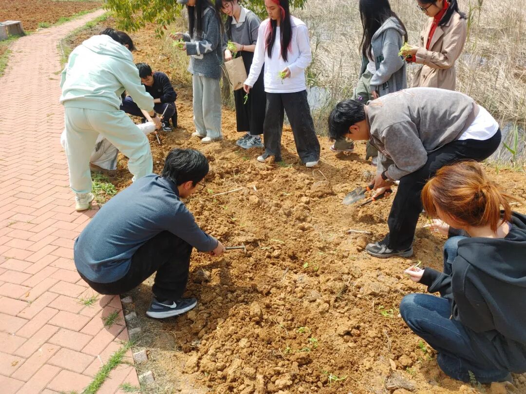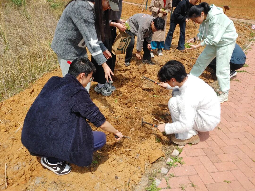 接着,学生们分组协作,挥锹铲土、分拣植物,亲手栽下了许多幼苗。同学们纷纷表示:“第一次体验种植活动,看着自己翻过的土地变成植物的家,特别有成就感!”辅导员还在种植的过程中引导学生在劳动中观察自然、记录感受:“植树不仅是体力劳动,还可以借助自然环境疏导情绪,更是生命责任的教育。通过照料植物,学会耐心与责任感,这种体验能丰富学生课余生活,舒缓学业压力。”