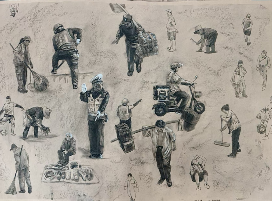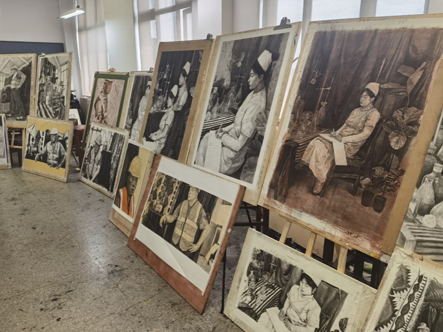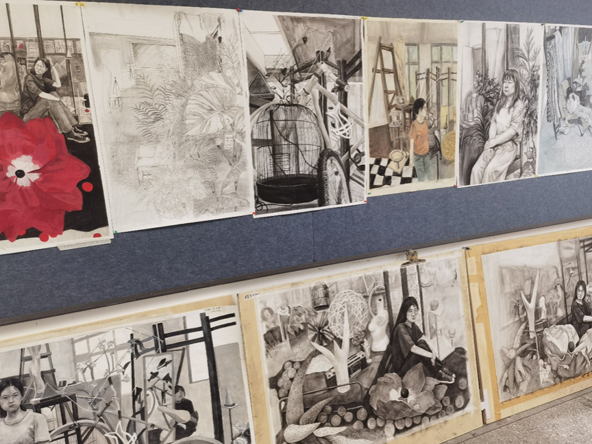 5.30日下午,在艺术教育学院A13教学楼3楼进行了本学期绘画专业《造型语言(素描表现)》课程的作业展示。作为新大纲制定后第二次上该课程,除涵盖大纲基本要求外,尝试融入“为人民造像”活动,并鼓励部分同学尝试2米左右大尺幅画面,通过载体大小的改变迫使学生在绘画方法上进行尝试与突破。最终展现出的素描作业整体面貌呈现出多样化的风格、有多种技法与材料的试验与运用,这是同学们辛勤努力的结晶,也是大家对素描艺术深入理解和创新探索的体现。