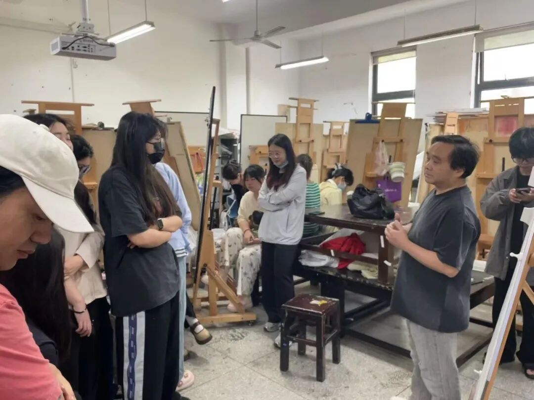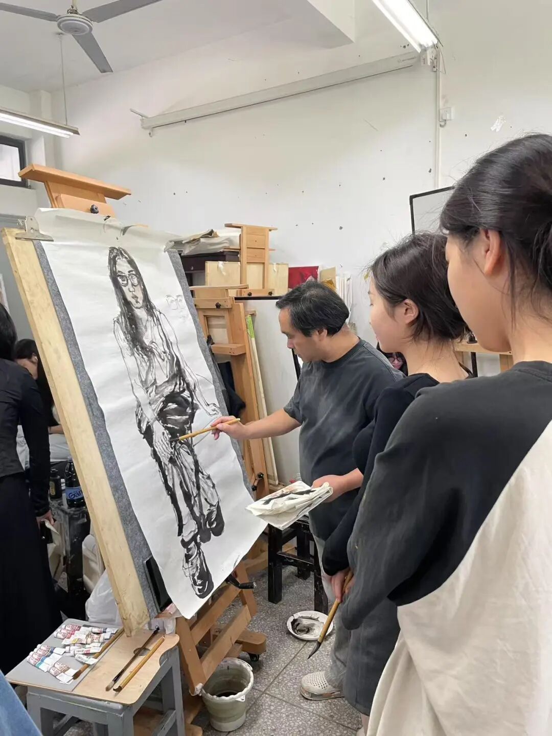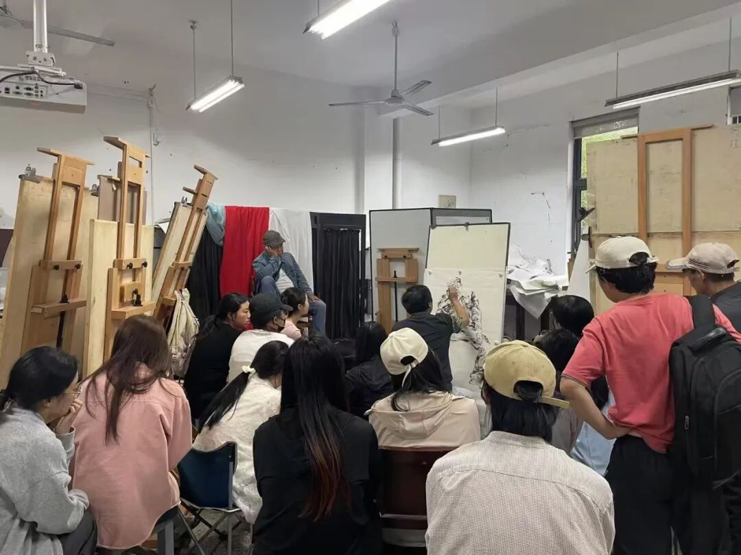 除了集体讲解外,钟教授也注重个体辅导。他频繁穿梭于画架之间,实时指出问题、现场演示修改方法、分享创作经验,教学过程既严格又富有温度。