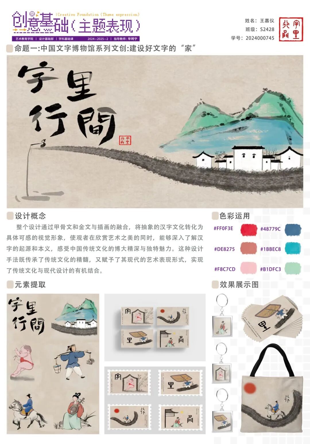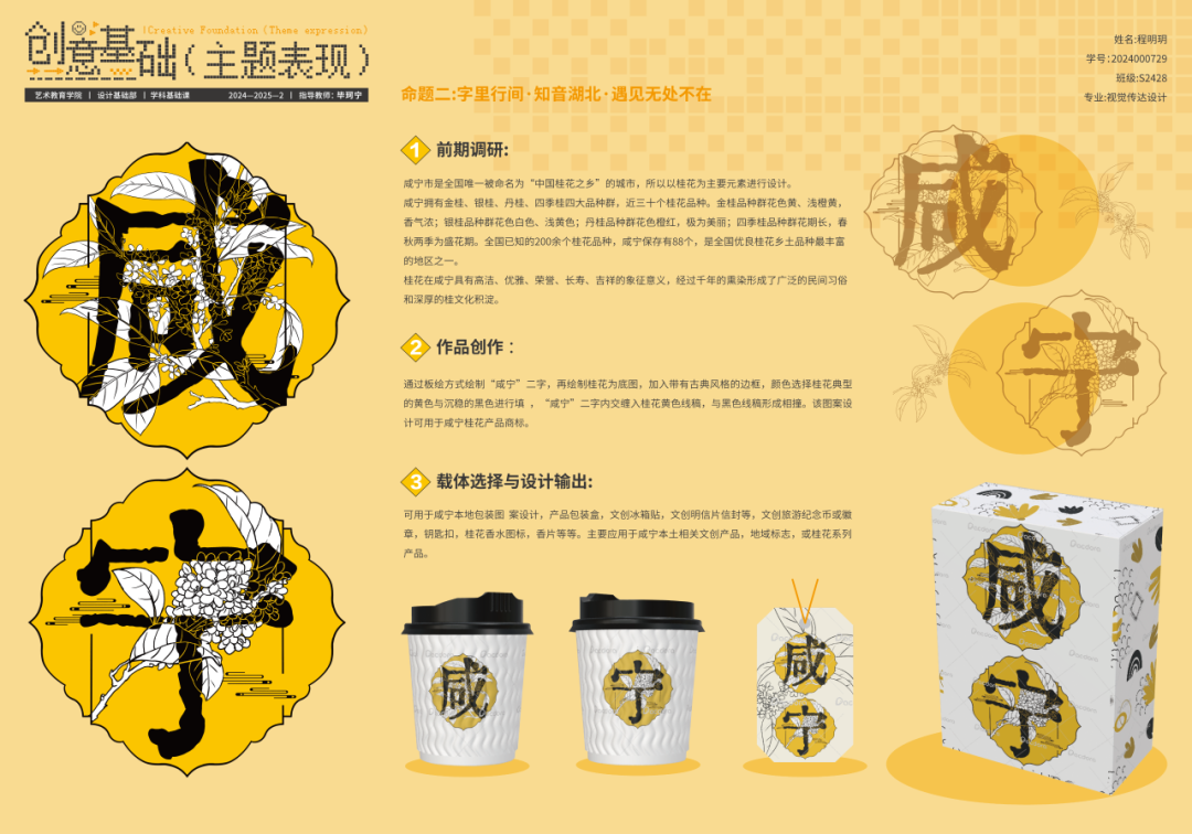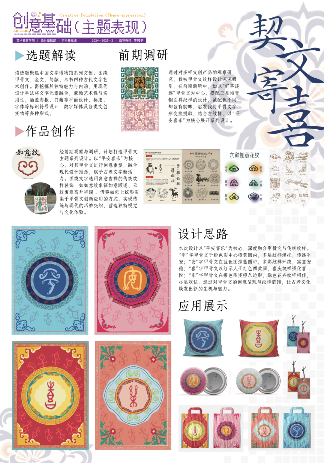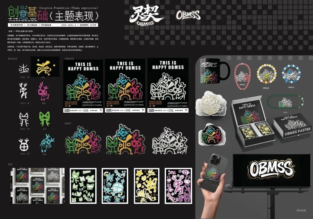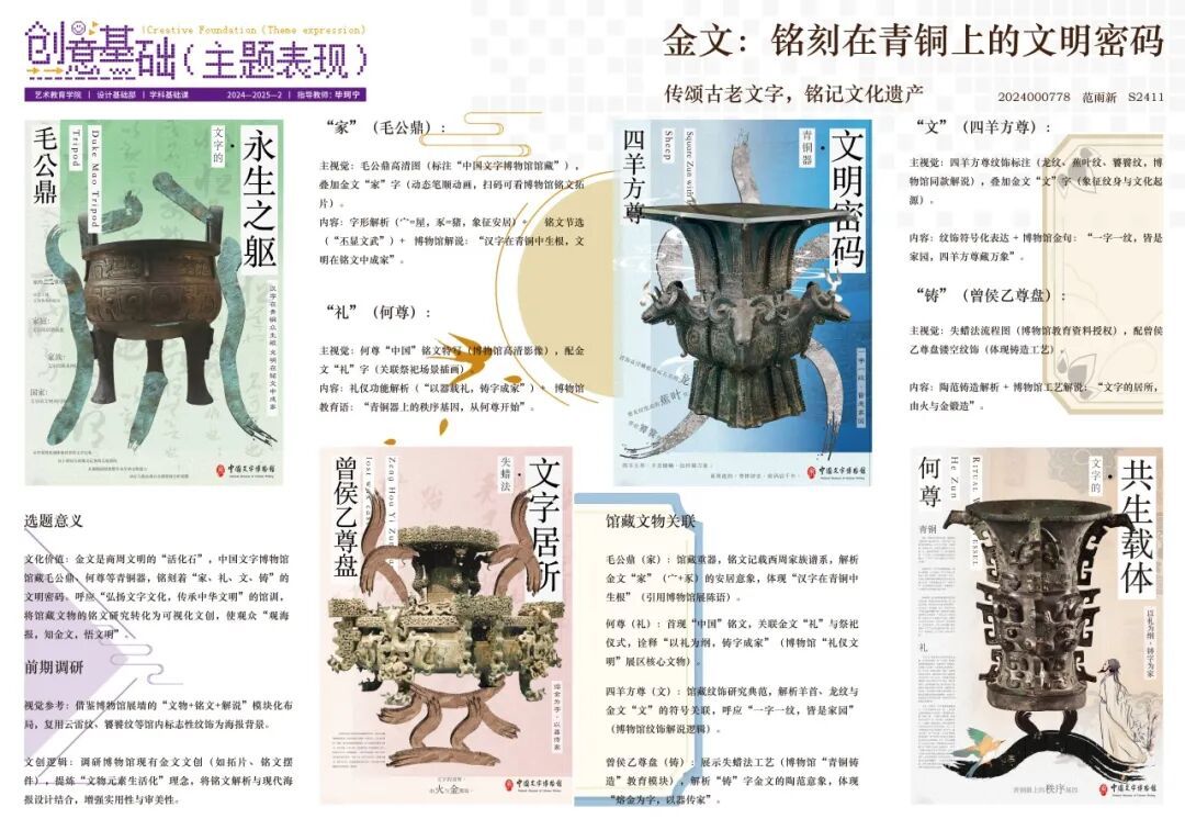 《创意基础(主题表现)》课程面向本科一年级下学期学生开设,在本次的项目式教学中,针对专业基础尚浅的学习阶段,课程教师组精心设计了三段递进式教学目标,首先培养学生对汉字文化的认知与提炼能力;其次训练其将文化元素转化为现代设计语言的实践技能;最终提升设计全流程的系统化呈现水平。在为期四周的教学中,通过“文化解码—创意转化—成果输出”的系统训练,学生在教师指导下完成了从方案构思到作品落地的全过程,最终呈现出一批兼具文化内涵与创新表达的汉字主题文创、海报及插画作品。