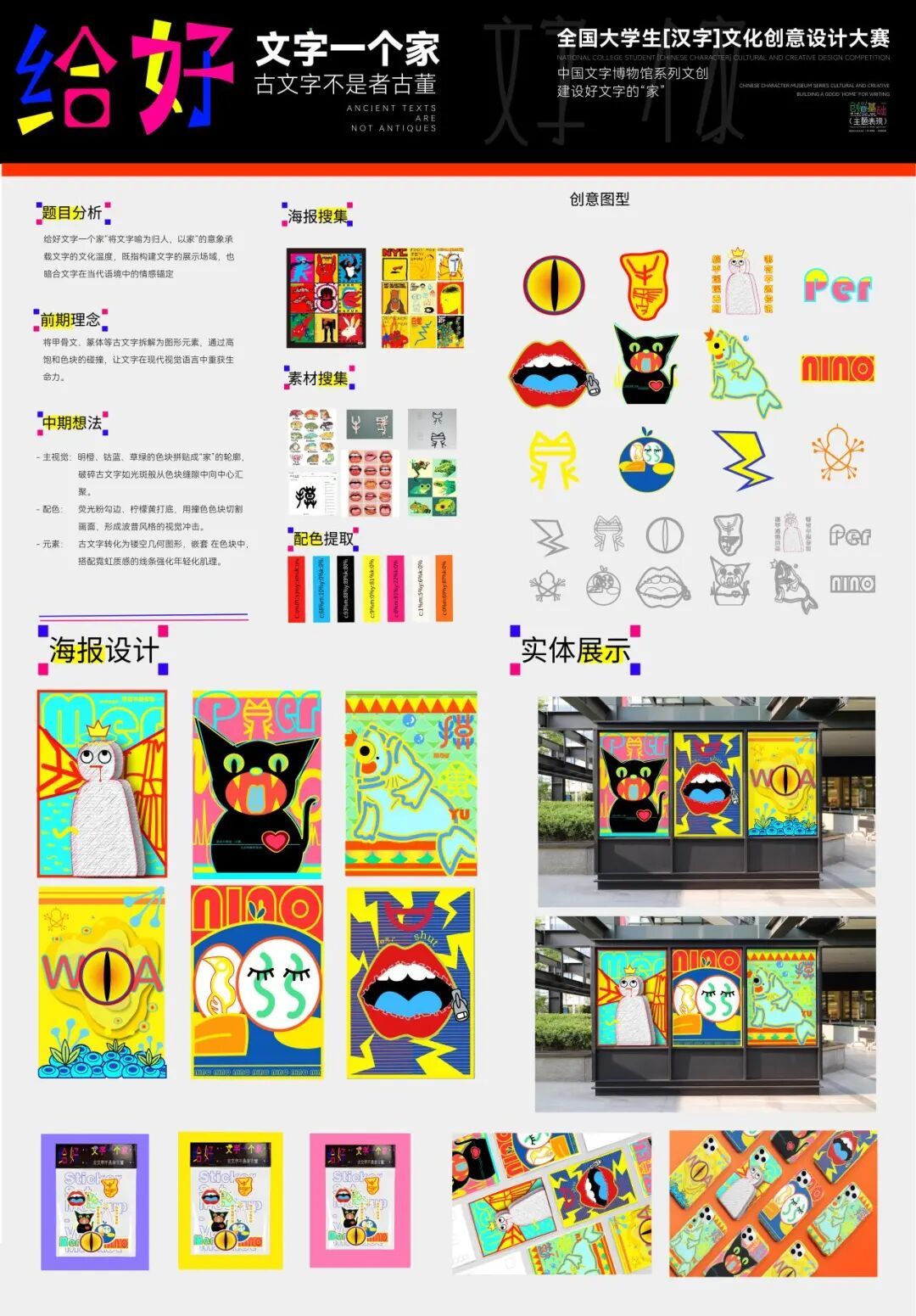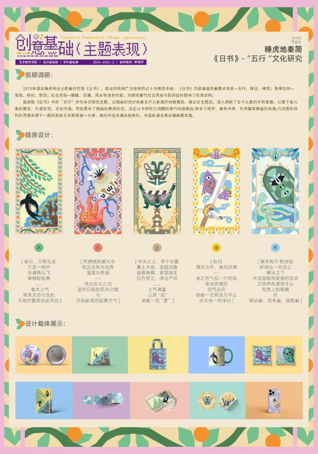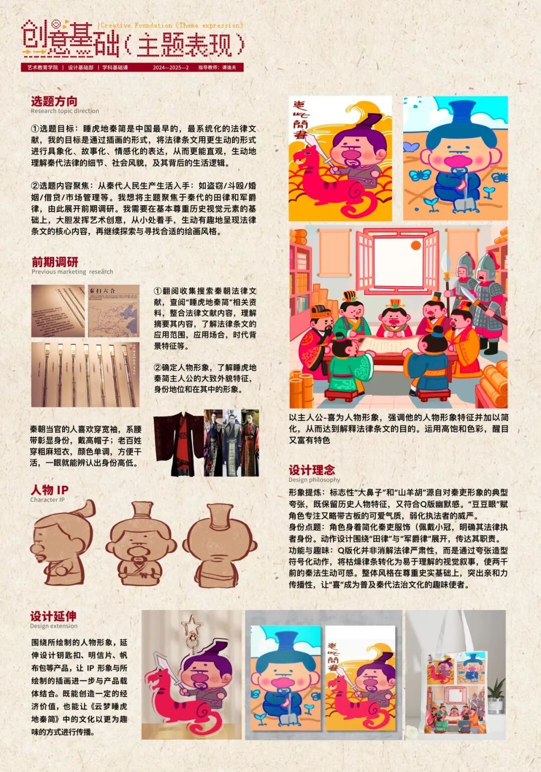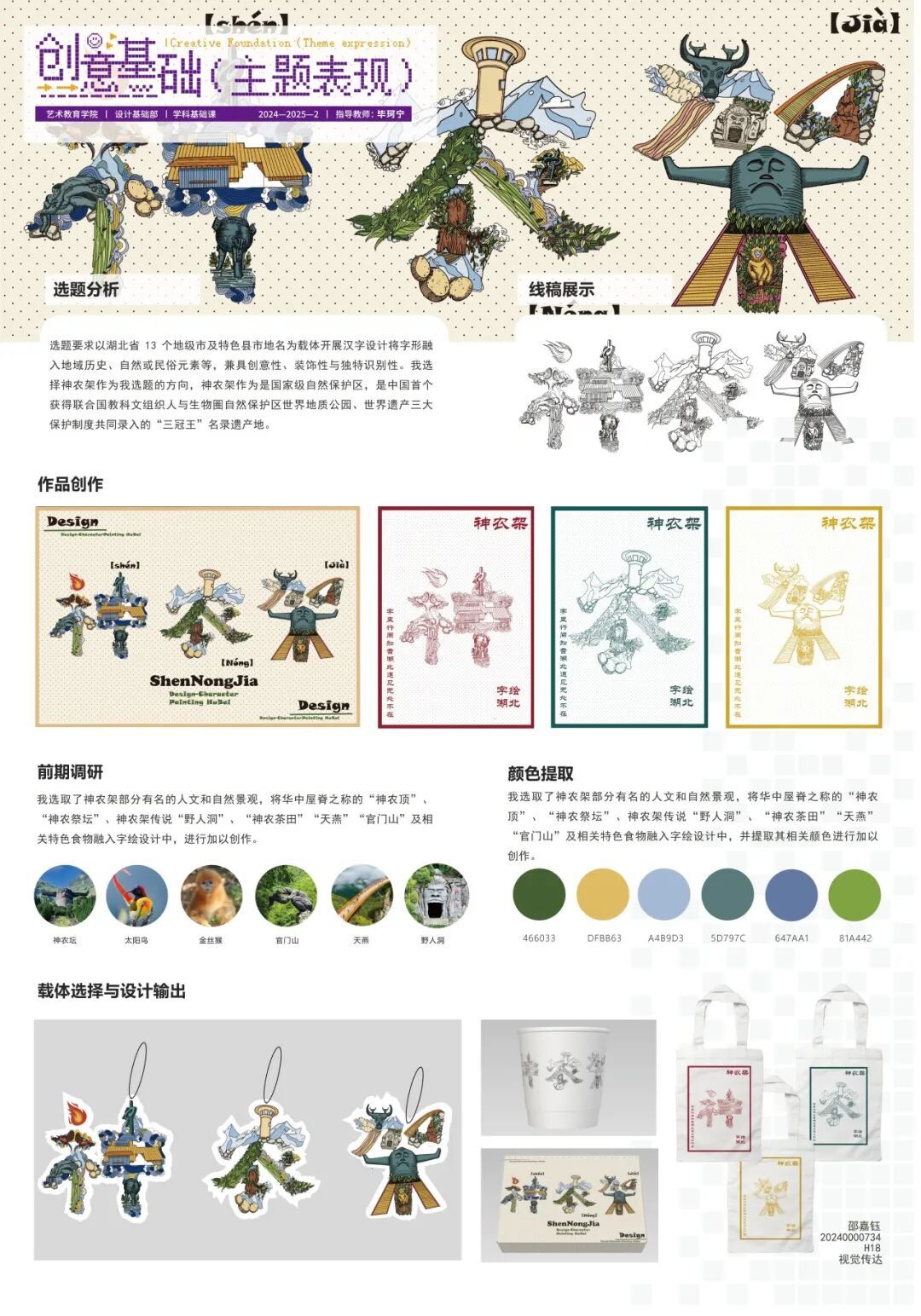 《创意基础(主题表现)》课程面向本科一年级下学期学生开设,在本次的项目式教学中,针对专业基础尚浅的学习阶段,课程教师组精心设计了三段递进式教学目标,首先培养学生对汉字文化的认知与提炼能力;其次训练其将文化元素转化为现代设计语言的实践技能;最终提升设计全流程的系统化呈现水平。在为期四周的教学中,通过“文化解码—创意转化—成果输出”的系统训练,学生在教师指导下完成了从方案构思到作品落地的全过程,最终呈现出一批兼具文化内涵与创新表达的汉字主题文创、海报及插画作品。