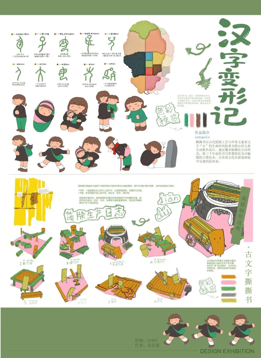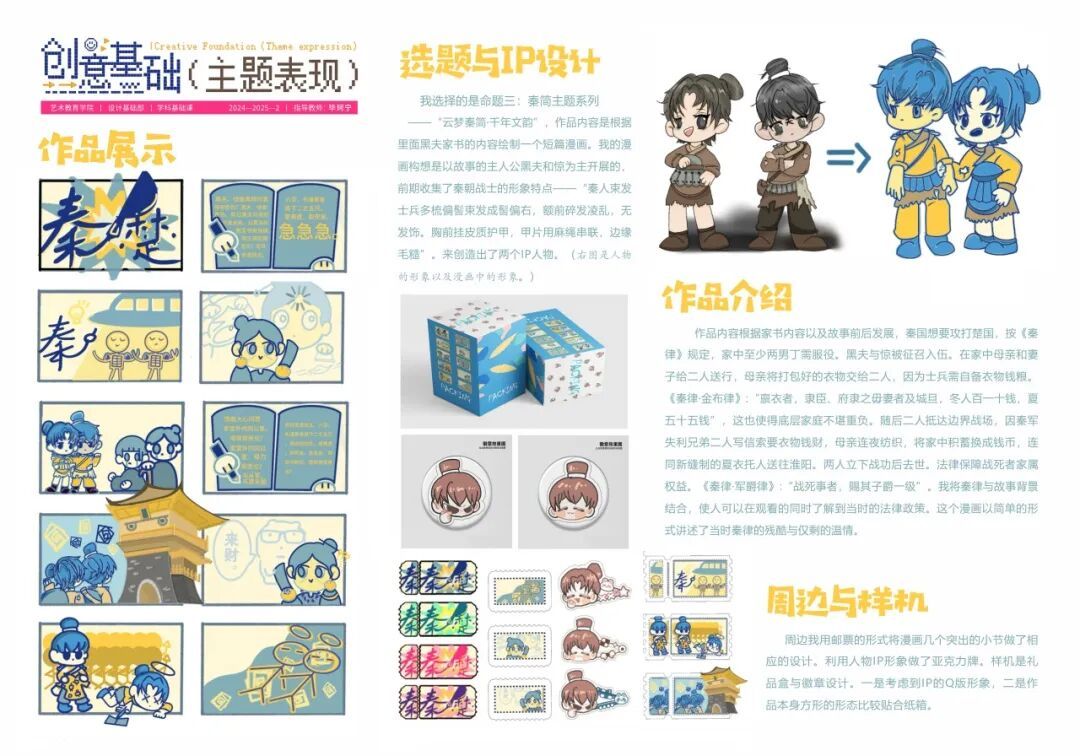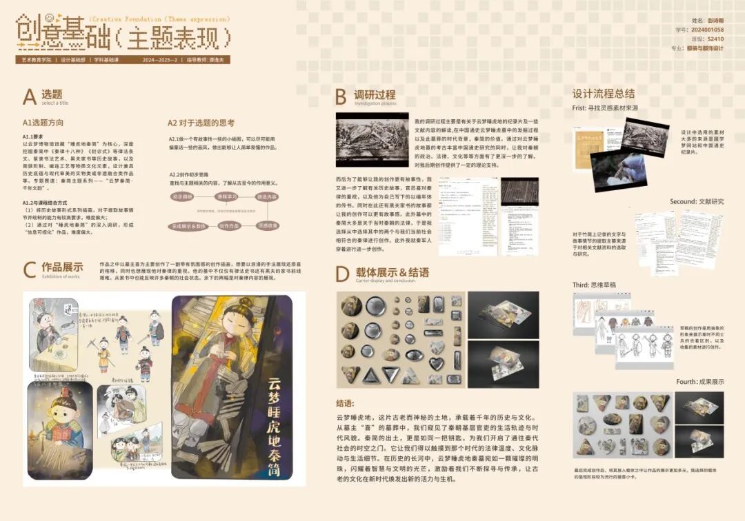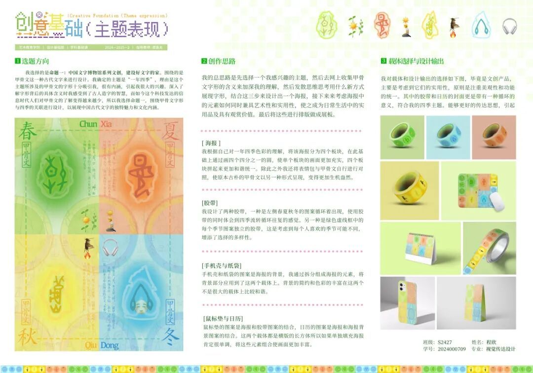 我的核心收获是掌握了主题创作思维,即面对选题时(如古文字),要学会提炼主题并在作品落地过程中聚焦于实用性。最终完成“象形字与简牍—汉字变形记”儿童撕撕书设计,从手稿到实物呈现,是一次从混沌到清晰的宝贵实践。通过本门课程的学习,我进一步认识到:设计是观察、感受、表达与转化的长期积累,这些基础能力的沉淀,为我之后的学习之路打下了坚实基础。