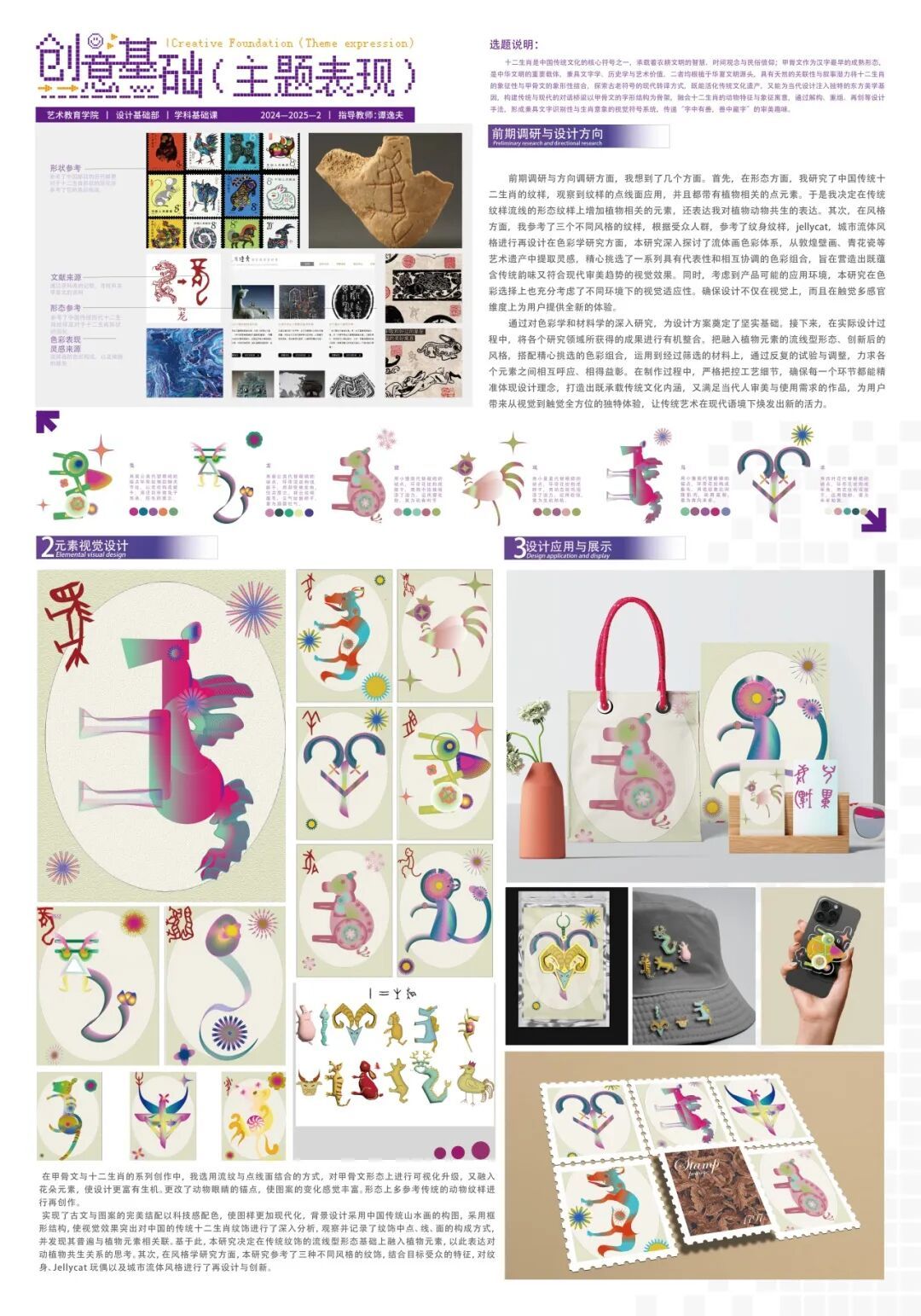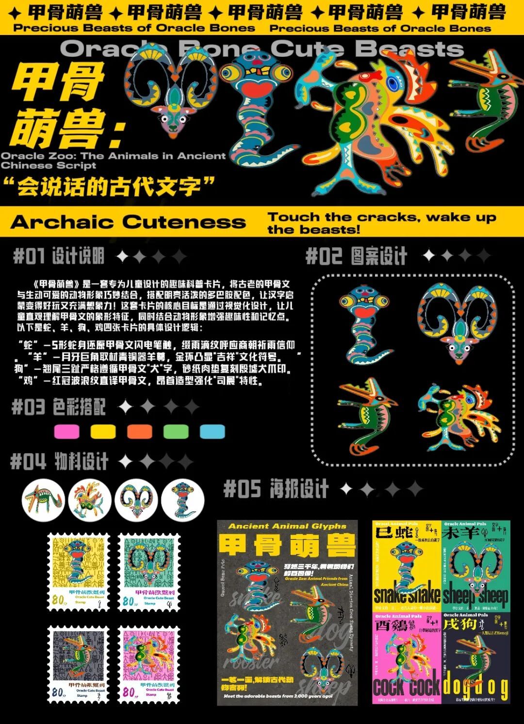 余茉含(S2405):在《创意基础(主题表现)》课程中,我以“甲骨文与动物形象结合”为思路完成《甲骨萌兽》系列设计,涵盖海报、邮票、文创等作品。通过研究甲骨文中蛇、羊、狗、鸡等字的象形特征,我深入理解了其背后的文化内涵,并尝试用现代设计语言重新诠释,如保留甲骨文笔触的同时融入类似砂纸粗糙的材质增强触感。跨媒介实践让我学会系统思考设计逻辑,邮票结合科普功能,文创热缩片展现汉字演变,数字技术则优化了线条表现。这次创作让我认识到文化深挖的重要性,也意识到技术表现仍有提升空间。未来希望继续探索传统文化活化,让古老符号以更鲜活的方式融入当代生活。