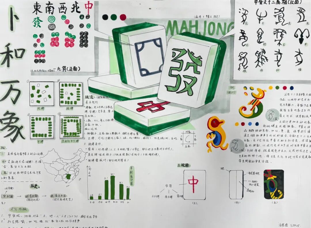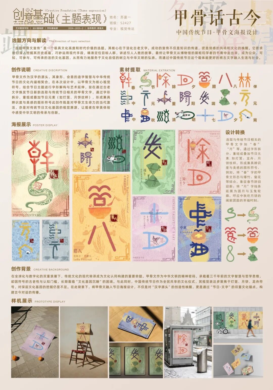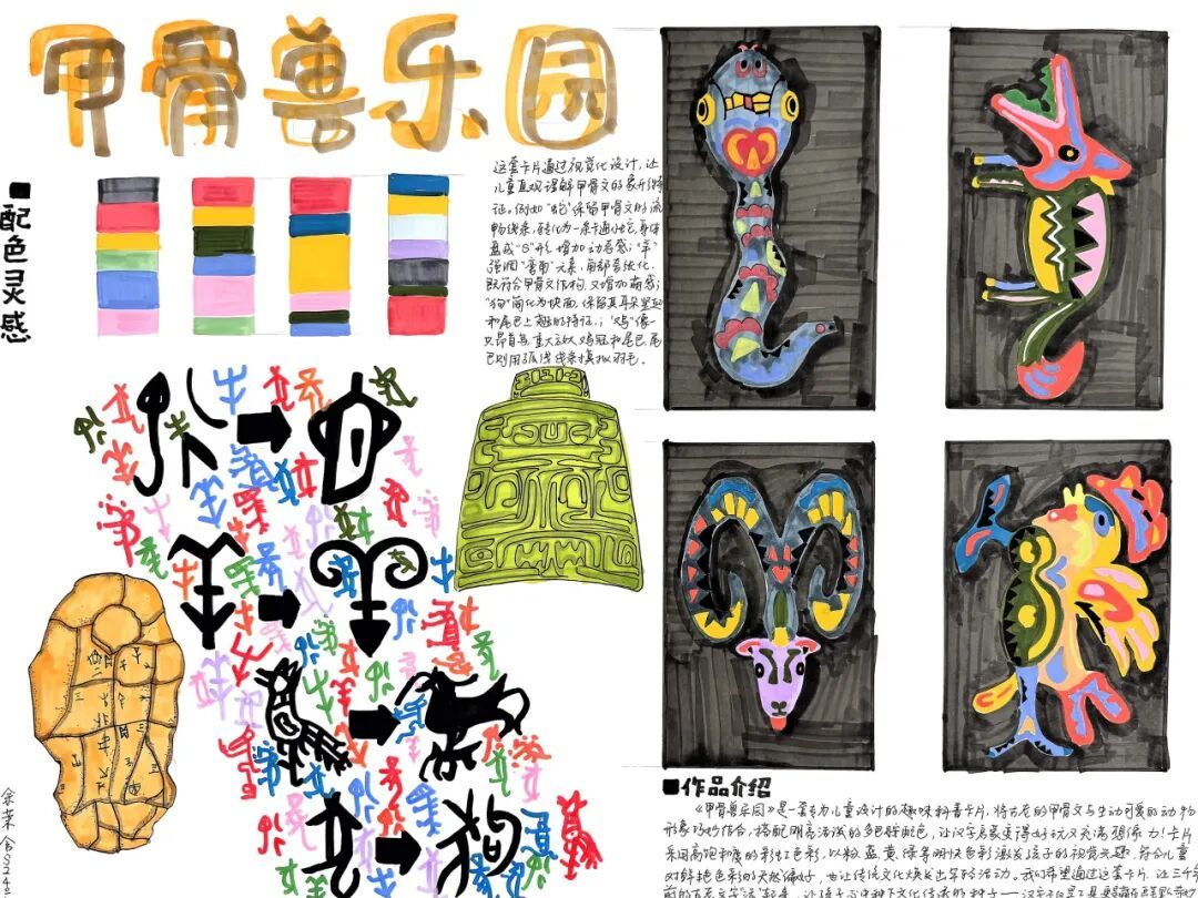 这门课程也让我明白,创意不是凭空产生的,而是源于对基础元素(如文字)的深度挖掘和突破边界的勇气。文字的艺术延伸本质上是思维与表达的解缚,让我看到沟通的无限可能——原来文字是鲜活、会呼吸的生命体。这也正是我作品《甲骨话古今》命名的意义所在。