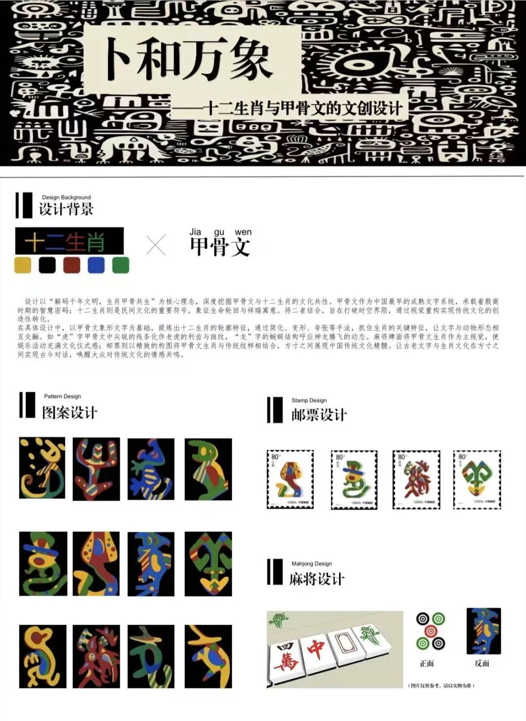 设计之初,我选择了十二生肖作为设计对象。因其象形特征突出、形象普及度高、文化认同感强,能自然链接古今。接下来我通过临摹十二生肖的甲骨文字形分析笔画结构与象形逻辑。 例如“龙”字突出其蜿蜒形态,“兔”字强调灵动线条,确保文创元素具备文化溯源与视觉辨识度。其次通过将字形转化为像素点阵,通过不同密度与排列组合测试视觉效果,寻找传统韵味与现代科技感的平衡点。 最后我提取字形中的三角形、圆形等几何元素,进行模块化重组,形成既独立又统一的系列符号。最终创作了一系列包括博物馆礼品包装,邮票,文创设计介绍册的文创产品。像素化与几何化的结合使其适配多种现代风格场景。