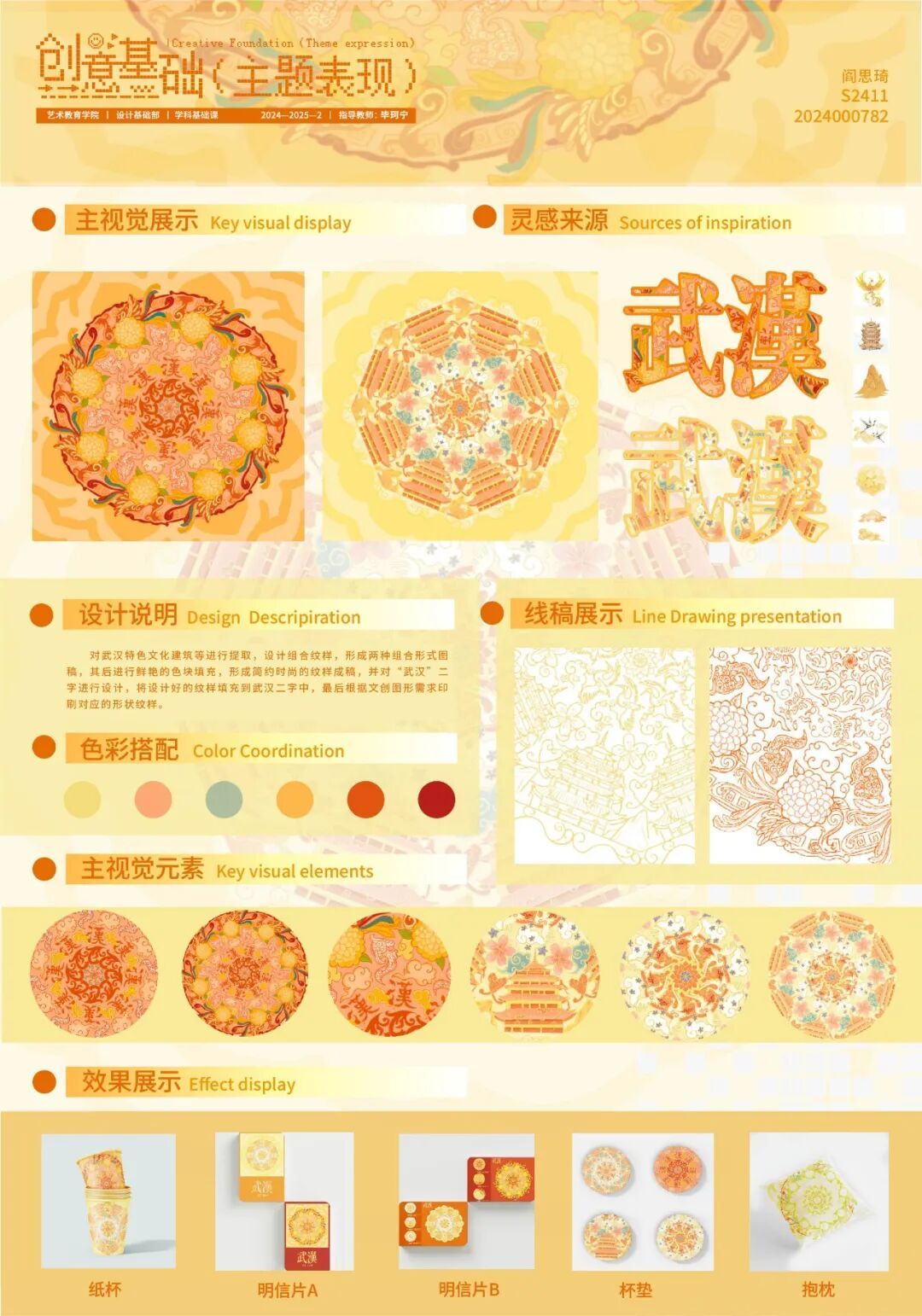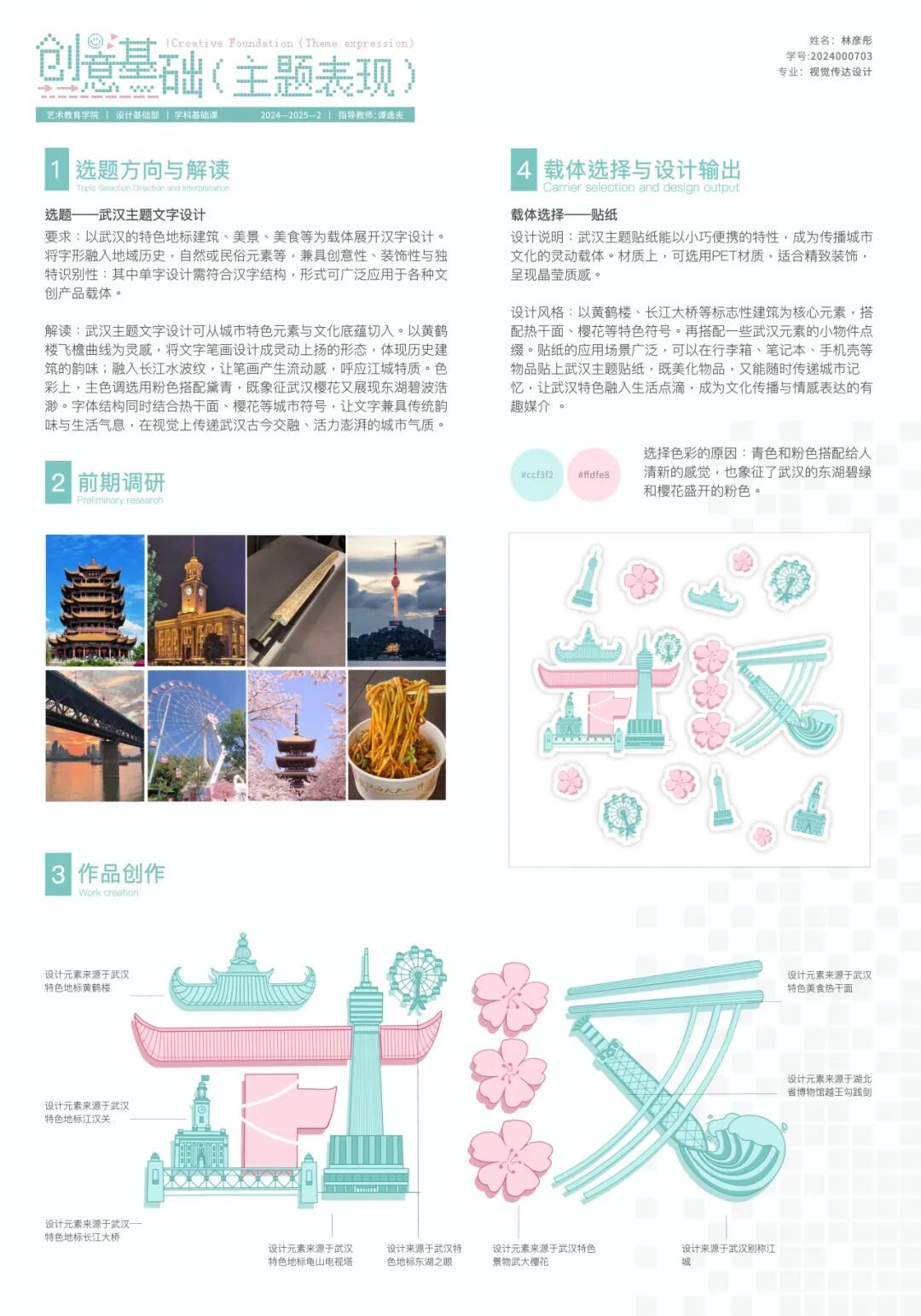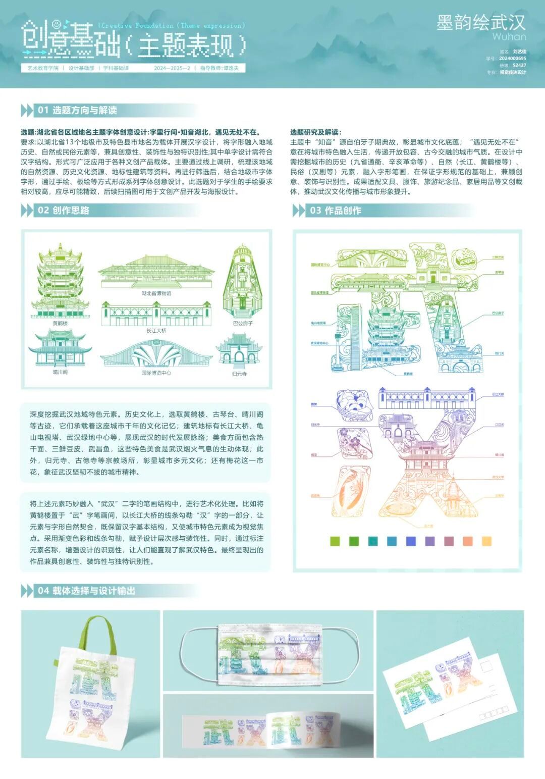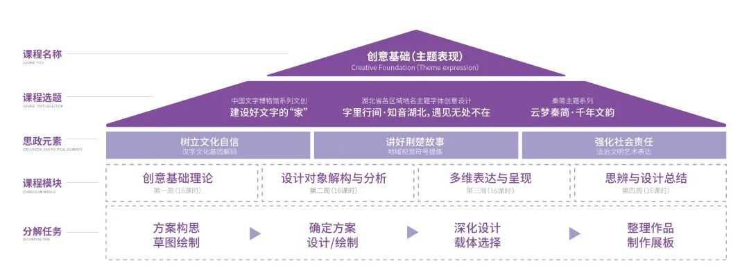 在为期四周的课程中,按照课程模块对课程任务进行相应分解并实施。同时,课程结合不同选题有机融入课程思政元素,引导学生对汉字文化基因解码,树立文化自信、对地域视觉符号提炼,讲好荆楚故事、围绕法治文明进行艺术表达,强化社会责任。通过“专业+思政”的双轨教学模式,实现知识传授与价值引领的同频共振。