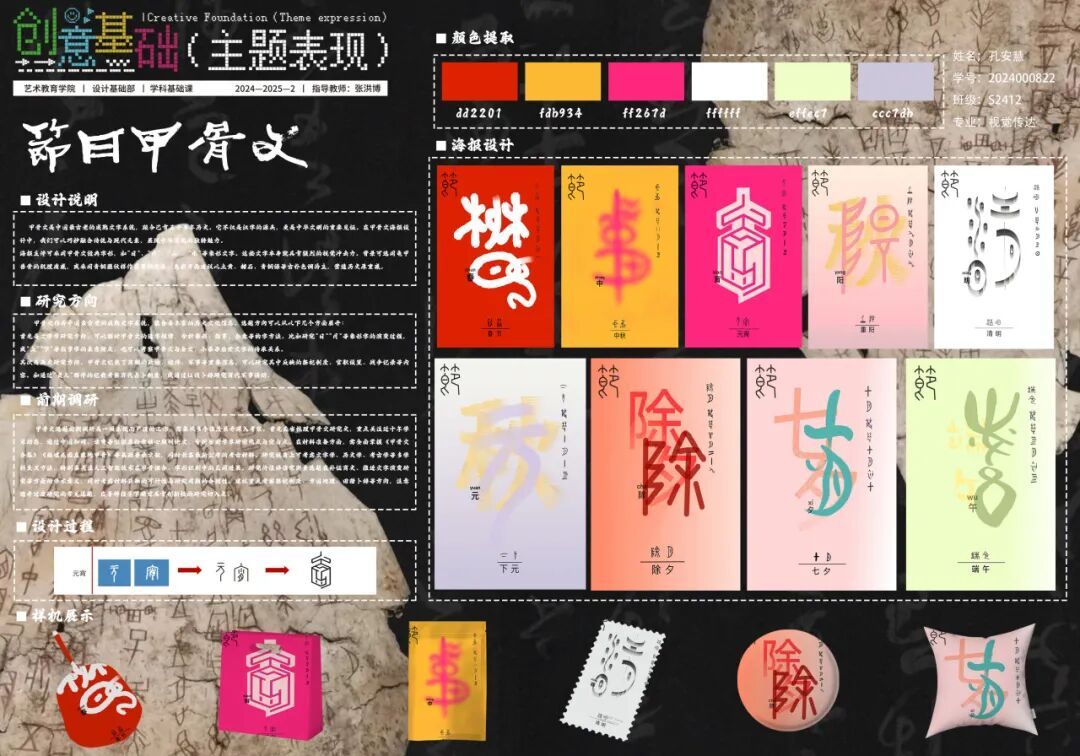 苏夏一(S2427):在《创意基础(主题表现)》课程中,以文字为主题的系列课程命题打破了我对传统文字的认知。古老的文字不再是传递信息的“冰冷”符号,而是被赋予了无限可能的艺术媒介。在创作中,我选择对甲骨文进行重塑,将文字分解后融入传统节日元素进行重组,实现了甲骨文与传统文化的有机融合。这让我深刻认识到文字本身具有强大的造型潜力和情感张力,每一次对字形的创新演绎,都是与古老智慧跨越时空的对话。