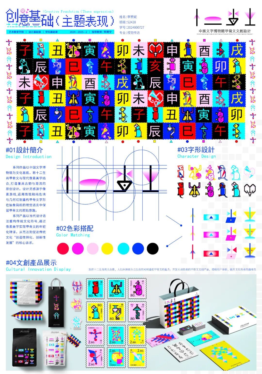 李赞妮(S2428):本次设计中,围绕“‘像’由肖生”的设计主题,我以中国文字博物馆的甲骨文文化传播为切入点,选取十二生肖甲骨文作为主要元素,通过字形解构、几何抽象化和像素化处理,探索传统文化与现代设计的融合路径。