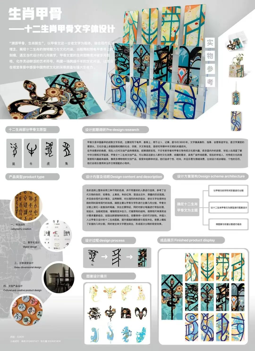 曾晖(S2410):通过本次课程实践,我深入探索了将古文字转化为纹样图案的设计方法论。在文创产品开发中,我尝试对甲骨文这一古老的汉字进行创新呈现,设计的系列作品不仅提升了人们对非遗文化的认知,还将流体艺术的肌理语言融入传统纹饰创新中,形成了独特的设计语言体系。本次课程让我深刻认识到,优秀的设计创新需要文化基因的支撑、更需紧贴市场需求,实现跨媒介技术的融合。期待未来能将这种多维度创新思维转化为更具影响力的设计实践。
