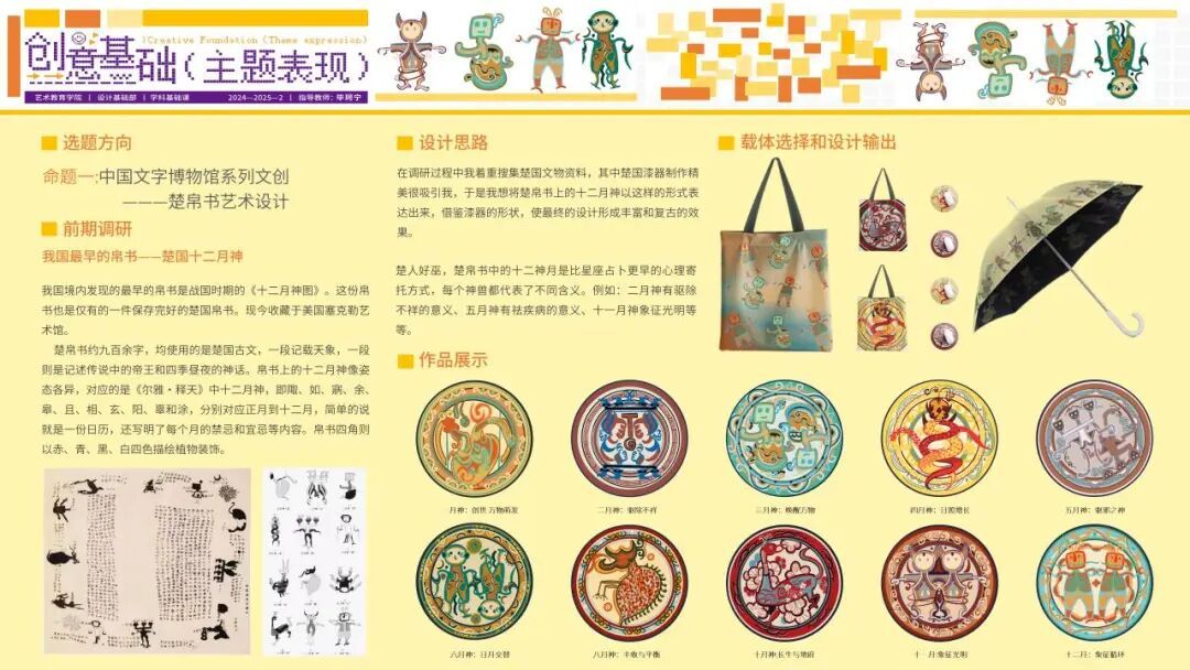 本次课程选题源于中国文字博物馆、中国传媒出版商报、湖北省新华书店(集团)有限公司共同主办的 “汉字文化创意周” 项目。课程组教师围绕 “汉字文化创意” 系列选题,指导学生开展研读、调研、设计、绘制等工作并产出相关作品,其中经评审选出的优秀作品将由主办方纳入后续开发计划,本次课程对标市场需求并进行成果转化的校企联动模式是设计基础课程项目化探索的一次有益尝试。