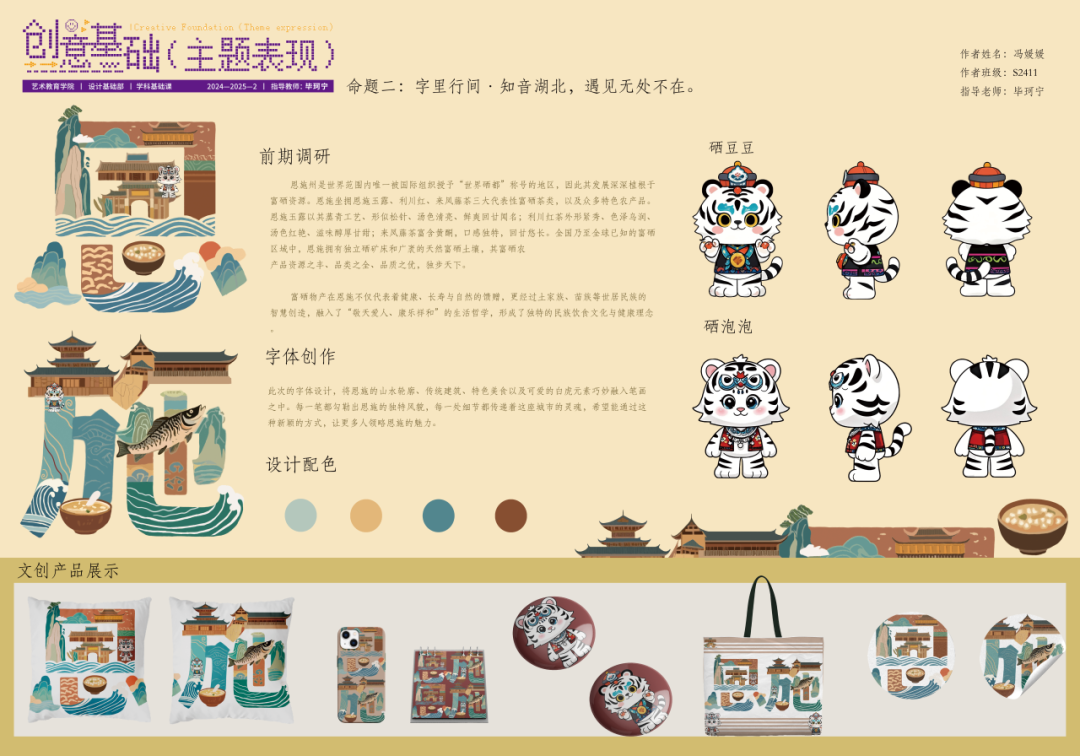 冯媛媛(S2411):在以恩施为主题的字体设计实践中,我深刻体会到地域文化与创意设计融合的魅力。从提炼 “自然秘境” 等关键词到融入西兰卡普纹样、吊脚楼轮廓等元素,我学会通过 “符号转译” 将抽象文化转化为视觉语言。在 PS、AI 软件实操中,深绿与靛蓝的配色选择让我理解色彩对主题表达的重要性。本次课程中,老师引导我逐步构建从主题提炼到设计转化的思维认知,这是一次收获颇丰的设计基础课程学习体验。