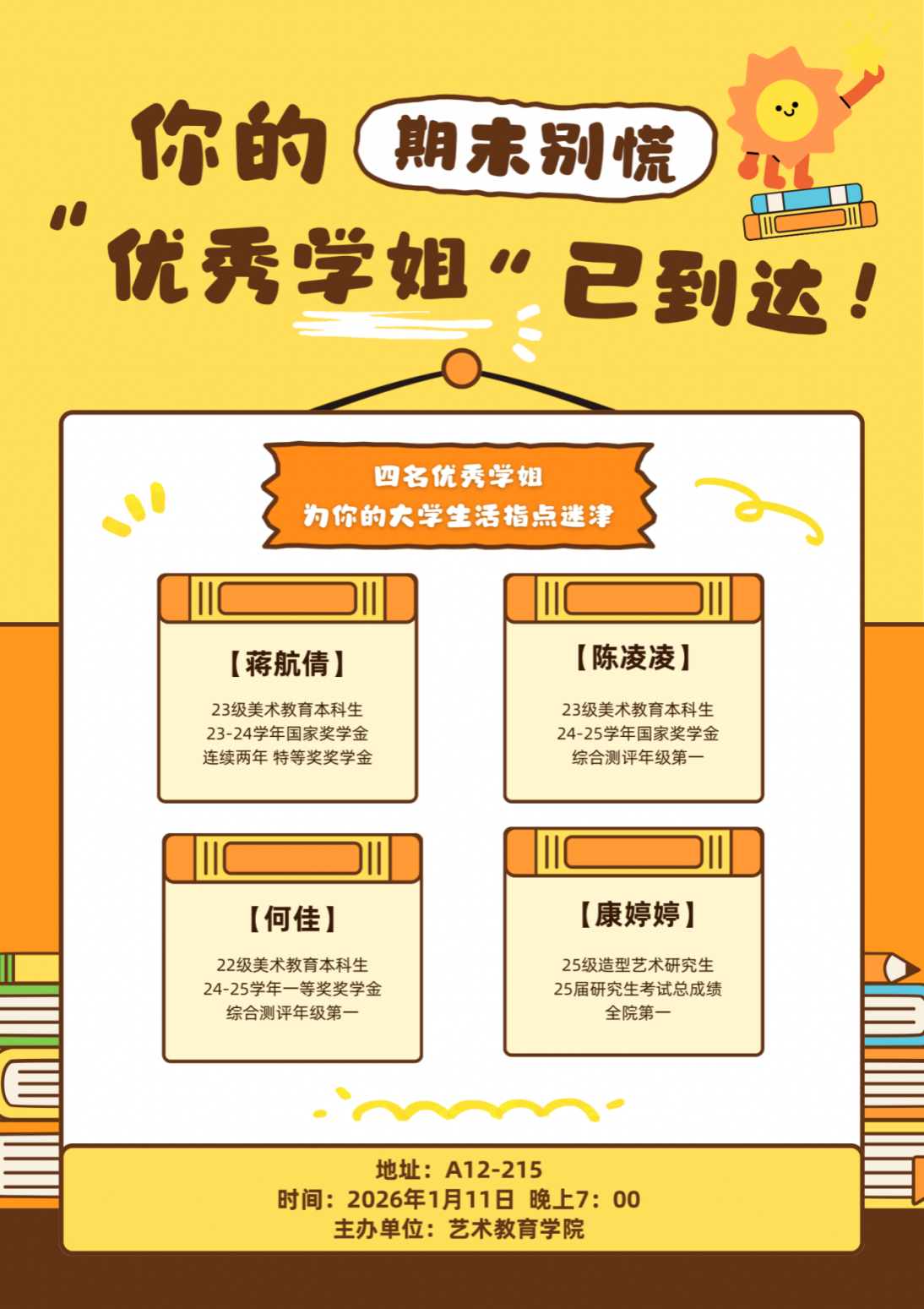 为帮助低年级同学更好适应大学节奏、明确学习目标、科学规划未来,1月11日晚,艺术教育学院在A12-215教室召开“朋辈引领·共话成长”主题班会。学院2024级、2025级全体本科生参加,活动由辅导员代居念主持。