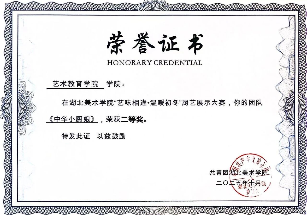 2024年11月7日,在湖北美术学院第十五届“红黄蓝”文化艺术节厨艺大赛中,艺术教育学院代表队凭借独特创意与扎实厨艺,荣获二等奖。同学们将艺术元素巧妙融入菜品设计之中,展现了“艺术+生活”的美学理念,赢得了评委的一致好评。此次获奖不仅是对同学们烹饪技能的认可,更是对艺术教育学院学子创新意识与团队协作能力的充分肯定。学院将持续推进“五育并举”,鼓励学生在多元实践中实现全面发展。
