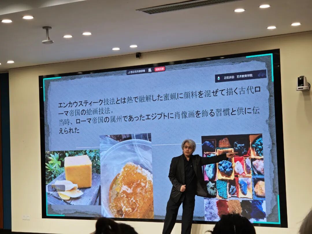 讲座内容脉络清晰,层层深入。赤木范陆教授首先从热蜡画法的古老源头讲起,梳理了其历史演变与材料特性。随后,具体到如何运用热蜡法绘画,他通过分解步骤进行细致讲解,使在场学生能听得懂、学得会。在最后部分,赤木范陆教授分享了个人的艺术创作,将传统水墨技法与现代蜡画技术相结合,让我们感受到了他对中国文化的深入理解和对日本艺术的独到见解。