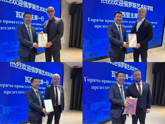 会后,湖北美术学院党委常委、副校长程智力代表学校,向俄罗斯艺术科学院主席瓦西里·采列捷利(Vasily Tsereteli)、俄罗斯美术家协会副主席叶夫根尼·罗马什科(Evgeny Viktorovich Romashko)、俄罗斯艺术科学院院士及国际交流处负责人谢尔盖·沙古拉维利(Sergey Shagulashvili)、俄罗斯苏里科夫美术学院副校长伊戈尔·戈尔巴秋克(Igor Vladimirovich Gorbatyuk)颁发聘书,聘请他们担任学校荣誉教授。程智力副校长强调,这些专家是俄罗斯艺术创作与艺术教育领域的领军人物,期待在双方交流合作下,推动湖北美术学院在艺术教学、科研创作、国际交流等方面迈向更高质量的发展。