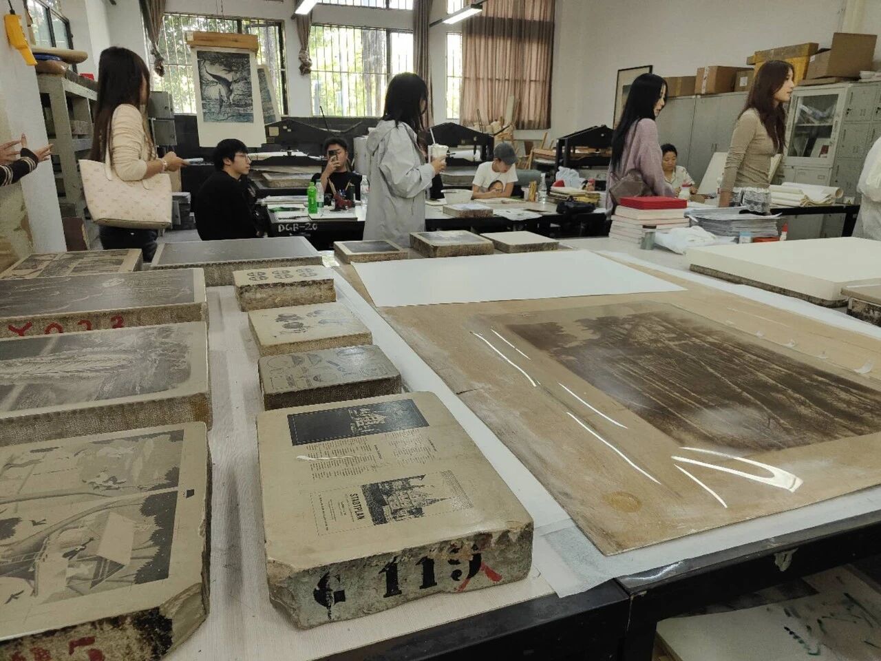 随后,在云南艺术学院美术学院相关负责人的引导下,我院师生还走进水彩系、雕塑系、壁画系的教学工作室与成果展厅。由美术学院副教授何阿平、水彩画系系主任周立明、壁画系副教授王洪云及系主任苏晓旺带领参观,从雕塑作品的材质运用、创作技法,到壁画作品的主题表达、色彩语言,师生们近距离观摩学习,并与现场专业教师、学生互动交流,进一步加深了对不同美术门类创作实践的理解,为后续专业学习与创作积累了宝贵经验。