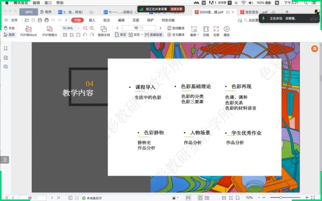 《造型语言(色彩再现)》课程实施过程中,学院领导与教师团队之间配合紧密,为课程的顺利进行提供了坚实的保障。本次课程的教学团队由余晖、陈小川、刘翔宇、陈进、刘凤仪、常莞清、胡丹、李蕾、郭子瑶九位教师共同组成。为了提升教学质量,优化课程设计,在《湖北美术学院本科教育教学审核评估阶段性工作方案》的指导下,课程团队于2024年11月13日进行了线上磨课会,会上老师们根据教学大纲集中备课。在整个教学过程中,教师不断进行阶段性的问题讨论,适时调整教学进度,并在课程结束时进行作品展示、总结汇报,所有环节均按照预定教学计划有序进行。课程期间,绘画基础部主任杜鹏、色彩教研室主任邱卿云、范楚婧多次前往各班级,与任课教师展开交流,深入了解学生学习进度以及每位教师在教学过程中遇到的实际问题,以确保教学质量与效果达到课程要求。艺术教育学院院长王灵毅也多次与教学团队进行深入的互动与交流,为教学团队提供了共同思考、不断优化教学内容与方法的平台,为后续课程的教学工作积累了宝贵的经验。《造型语言(色彩再现)》课程的成功实施,充分彰显了艺术教育学院在本科基础课程改革方面的坚定决心与信念,有效达成了“宽视野、厚基础、强能力”的基础教学目标。