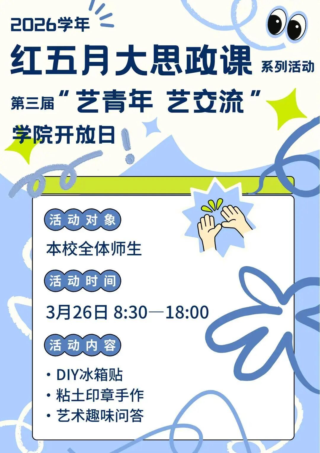 以艺会友,以美相融。作为2026年度红五月大思政课系列活动之一,第三届“艺青年 艺交流”学院开放日于3月26日至27日温情启幕并圆满落幕。湖北美术学院学子齐聚一堂,在创作与趣味互动中搭建起跨专业交流的温暖桥梁,让艺术创意在春日里肆意生长。本次开放日由艺术教育学院精心策划,以DIY冰箱贴、粘土印章手作及艺术趣味问答三大特色活动为载体,将手工创作的巧思与知识互动的乐趣相融,为各学院学子带来沉浸式的艺术交流体验。...