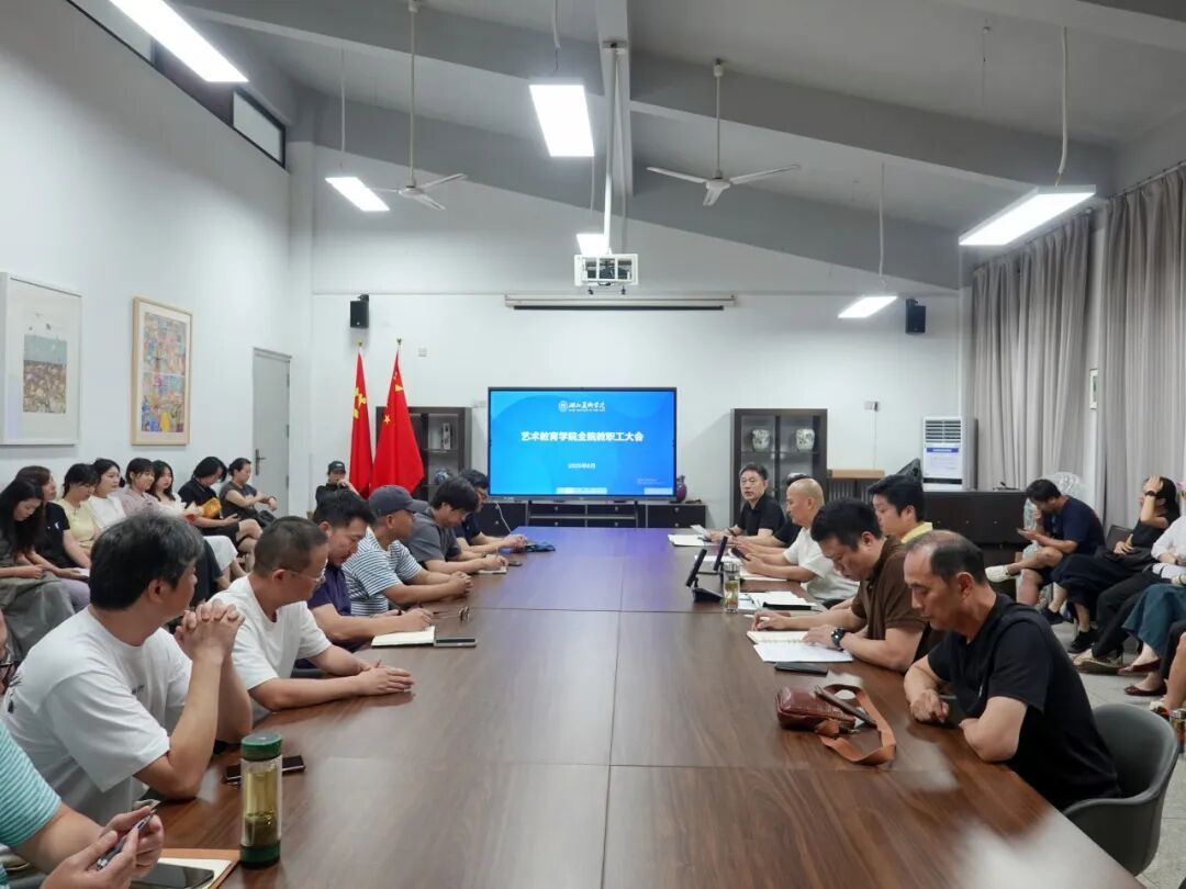 6月18日上午,艺术教育学院召开全体教职工大会,系统部署近期重点工作,统一思想、凝聚共识,推动学院事业高质量发展。会议由副院长周颢主持,全体教职工参会。与会成员集中学习学院党委书记张吴涛以《弘扬三大精神,汲取奋进力量》为题作主题讲话。他深入阐释了“大别山精神、抗洪精神、抗疫精神”的历史内涵与时代价值,强调这三种精神集中体现了中国共产党人坚定的理想信念、无私的奉献精神和勇于担当的时代气质。同时,张书...