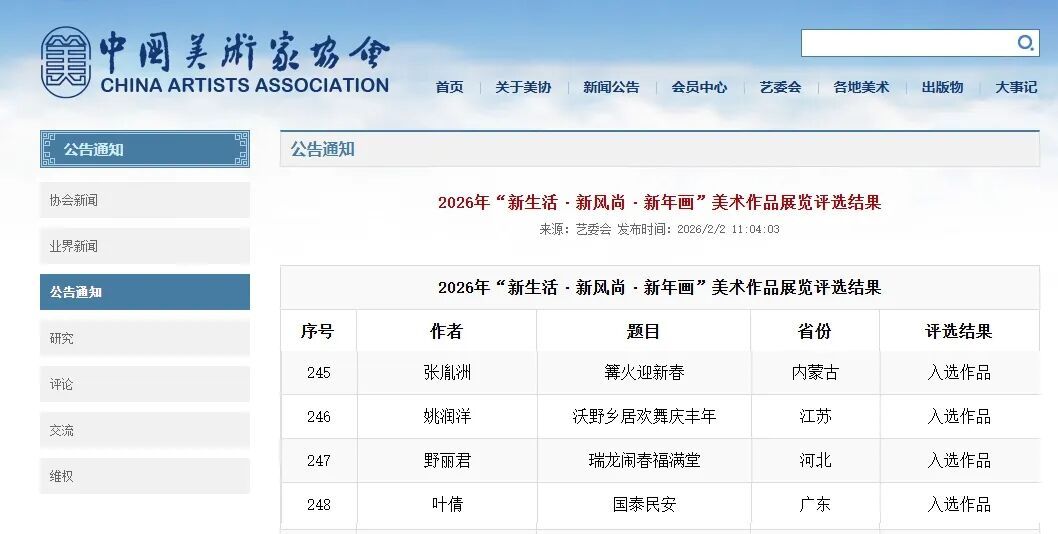 近日,2026年“新生活·新风尚·新年画”美术作品展览评选结果揭晓,艺术教育学院研究生姚润洋作品成功入选。为传承弘扬中华优秀传统文化,丰富人民群众精神文化生活,激励广大群众振奋精气神、共创新生活,中央宣传部文明实践局、文化和旅游部公共服务司、中国美术家协会、中国民间文艺家协会联合举办本次“新生活·新风尚·新年画”美术作品展览,活动面向全国征集优秀创作,经专业评审严格遴选,确定最终入展作品。姚润洋同学在...